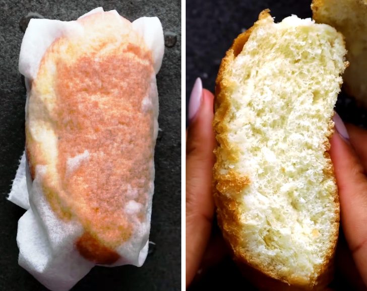 Можно пользоваться двумя способами. Для первого понадобится бумажное полотенце. Сначала необходимо завернуть в него черствый хлеб, а потом смочить небольшим количеством воды. Затем все вместе поместить на тарелку и поставить разогреваться в течение 1 минуты.