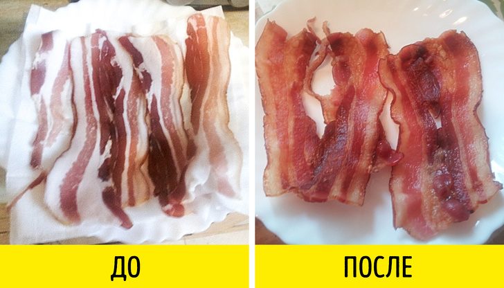 Бекон — отличная закуска, да и яичница на завтрак с ним станет гораздо вкуснее. Вот только поджаривать его долго. Ускорить процесс поможет микроволновка. Положите бумажные полотенца на тарелку, поверх них — несколько ломтиков бекона и снова полотенца. Через 5 минут нагрева на максимальной мощности блюдо готово. Кстати, таким образом бекон будет не таким жирным, ведь для жарки не использовалось масло, а его собственный жир стек на полотенца.