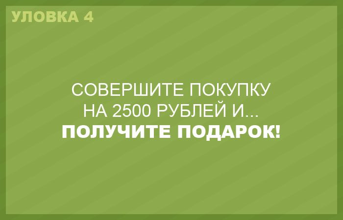 Некоторое время назад улицы городов заводнили печатные флаеры одной сети китайских товаров, в которых значилось, что за каждые 75 российских рублей в чеке будет дан подарок. И что бы вы думали? В магазинчиках сети выстроились огромные очереди. А оказалось, что подарком за каждую упомянутую сумму является набор из 10 влажных салфеток с ароматом арбуза, цена которым в дискаунтере — 5 российских рублей. Не трудно ли догадаться, что цена на китайские товары, закупленные по копеечным ценам оптовых поставок на Aliexpress, и так достаточно завышена, чтобы привлечь покупателей, а количеством проданного товара в сотни раз покрыть расходы на закупленные влажные салфетки. Выводы делайте сами!