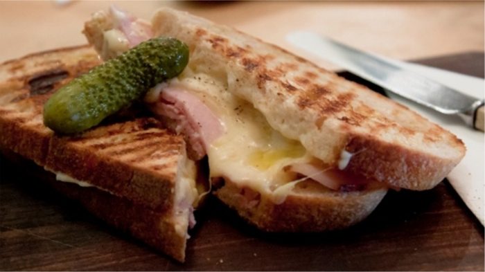 Сперва нужно выбрать и выставить в микроволновой печи один из самых высокотемпературных режимов, например, для готовки мясных полуфабрикатов. На выбранный вами хлеб кладётся фабричный слайс твердого желтого сыра или насыпается тертый сыр, затем кладется ломтик ветчины (если ее нет — сгодится докторская колбаса). Теперь нужен еще один слой сыра (слайс или тёртый), и всё сверху закроет второй кусок хлеба. Смажьте сендвич с обеих сторон растительным маслом и готовьте его в микроволновой печи на вышеупомянутом очень жарком режиме минут 5. Французский сендвич готов!