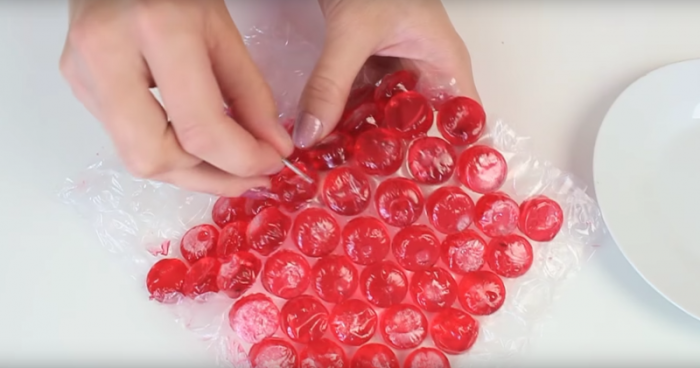 Для создания конфет помимо пленки понадобится также чистый шприц и желе. Для того, чтобы сладость получилась, нужно успеть закачать шприцом желе в «пупырышки» пока оно теплое, а после отправить импровизированную форму на 2 часа. По прошествии указанного срока останется только аккуратно извлечь застывшие конфеты.