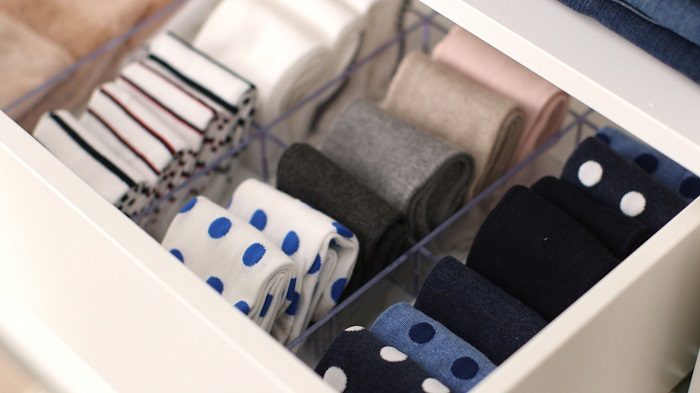 Наши бабушки и мамы обычно скручивали носки в клубок, чтобы один из них не потерялся. С одной стороны, этот подход можно считать практичным, так как он избавляет вас от тщетных поисков второго носка по всей квартире, которые обычно занимают не один час. Но, в то же время, такой способ приводит к тому, что ткань деформируется, а резинки растягиваются. Специалисты советуют укладывать носочки вместе, согнув пополам. Так они не будут мяться и менять свою форму. Желательно выделить для них отдельный ящик в шкафу, чтобы они не терялись.
