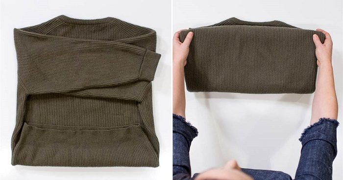 Лайфхак: Что касается свитера, то изначально нужно сложить рукава к середине изделия, чтобы они соприкасались. Затем следует завернуть нижнюю часть кофты назад до уровня плеч. Далее переворачиваете свитера на другую сторону и складываете три раза, чтобы получился аккуратный треугольник.