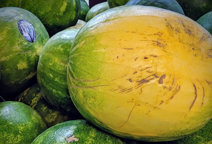 Осматривая арбуз сложно не заметить светлое пятно на одном его бочке. Это вполне естественное образование (место соприкосновения с землей в период созревания), которое лучше всего расскажет о спелости продукта. Если арбуз спелый, то пятно должно быть кремово-желтым или золотистым, но никак ни белым или коричневым.