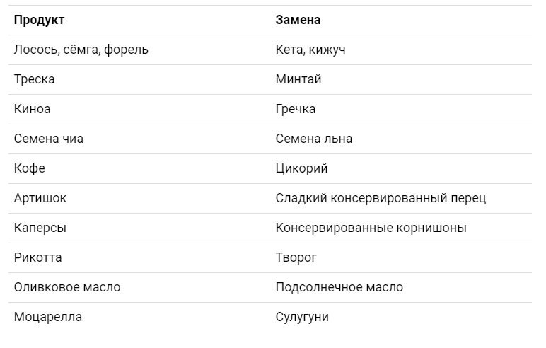 Правда, этот способ не подойдёт гурманам. Например, вместо греческого йогурта можно использовать сметану, вместо творожного десерта — творог и варенье, вместо анчоусов — кильку пряного посола, а вместо ягод годжи — клюкву и шиповник. Подобные аналогии проводятся и для других продуктов: