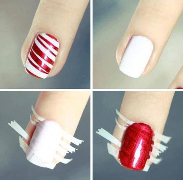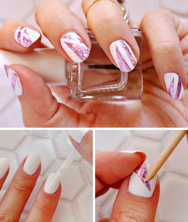 Чтобы придать покрытию фактуру в виде ромбовидного, треугольного, квадратного или еще какого угодно узора, вам так же понадобится клеющаяся лента для дизайна.Покройте ногти базой и цветным лаком, который решили использовать.