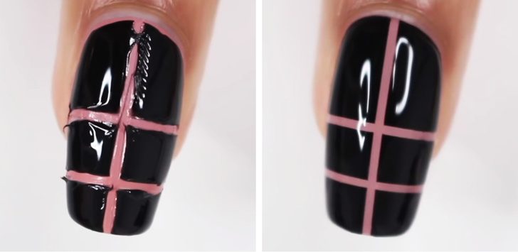 Линии между фигурами в таком типе маникюра могут быть как прозрачными, так и цветными или даже разноцветными. Зависит от того, какого цвета будет базовый слой. В данном случае он розовый: