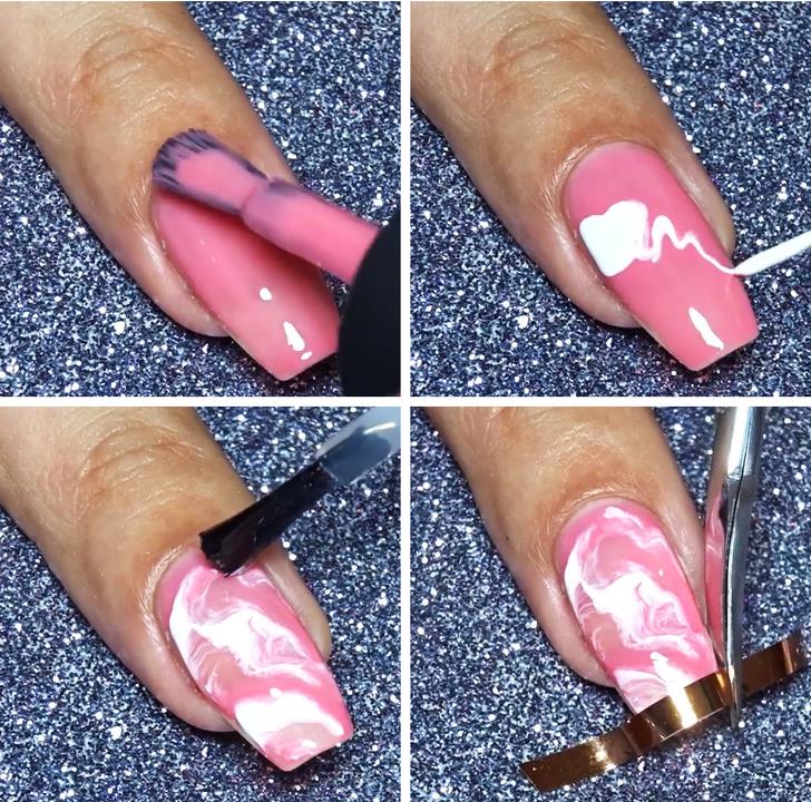 Эффект мраморных ногтей — впечатляющее, но при этом довольно минималистичное (в зависимости от выбранной расцветки) решение.Покройте ногти базой и лаком, но последний не сушите.