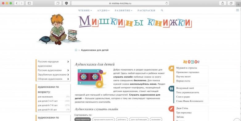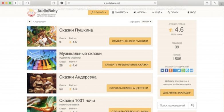 Простой портал с историями, которые можно включить ребёнку перед сном или когда нужно занять его на несколько минут. Помимо народных и зарубежных сказок, здесь есть целые романы и повести. Доступно скачивание любых файлов по прямым ссылкам для офлайн-прослушивания.