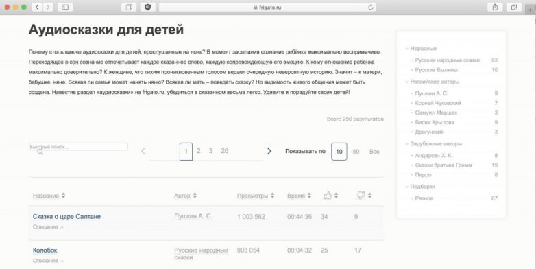 Простой по оформлению, но богатый по содержанию каталог детских произведений для всех возрастов. Здесь собраны популярные народные и зарубежные сказки, которые легко отсортировать по автору, рейтингу и продолжительности. У некоторых рассказов есть короткие и длинные версии, а также записи разных дикторов.