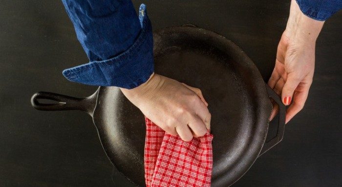 Прежде чем убирать чугунную сковороду в ящик, нужно убедиться, что на ней не осталось лишней влаги. Если упустить этот момент, то можно столкнуться с такой проблемой, как пятна ржавчины. Лучшее решение для длительной эксплуатации сковороды: после мойки протереть ее полотенцем и поместить на средний огонь, оставив до полного высыхания. Для этого потребуется 5 минут. Потом дать остыть и протереть еще раз, а только потом убирать на хранение. Еще один хороший вариант для предотвращения ржавчины: повесить чугунные сковородки на стену, где потоки свежего воздуха не дадут им испортиться.