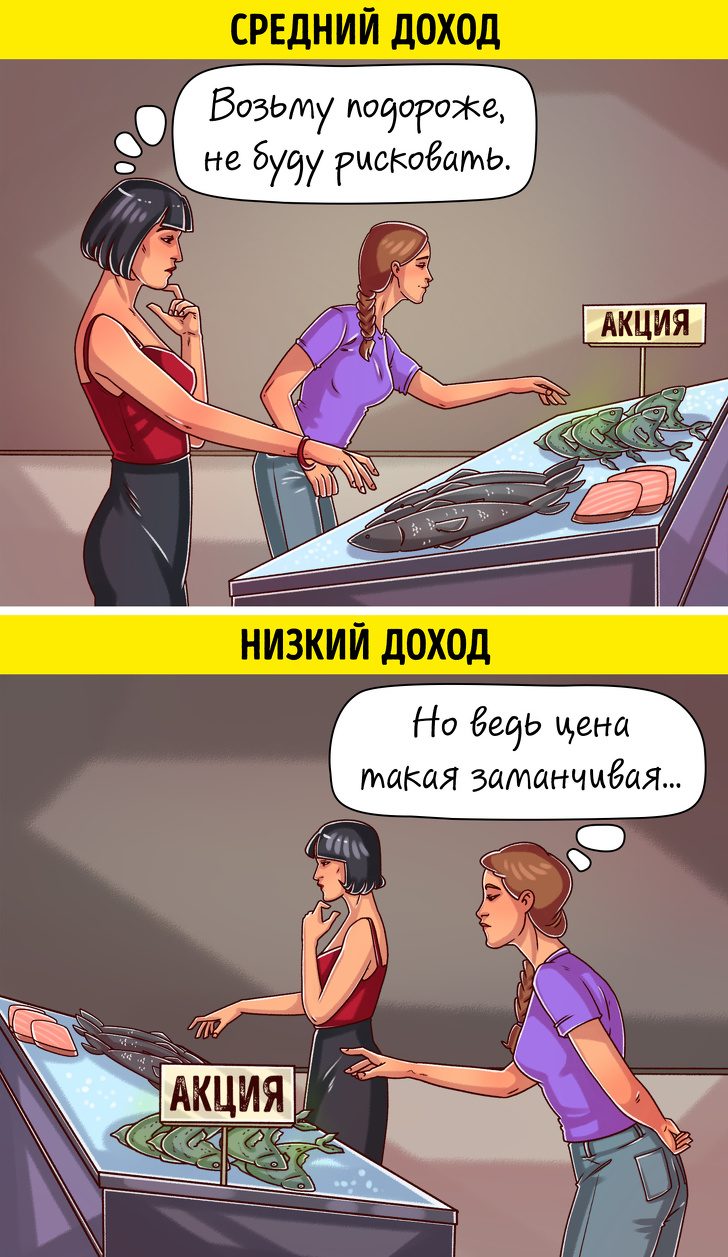 Одно дело — снижение стоимости товара нормального качества, и совсем другое — когда прилавок напоминает рулетку. Чем ниже доход, тем чаще покупатели рискуют. Например, берут рыбу, повторно умершую в магазине.