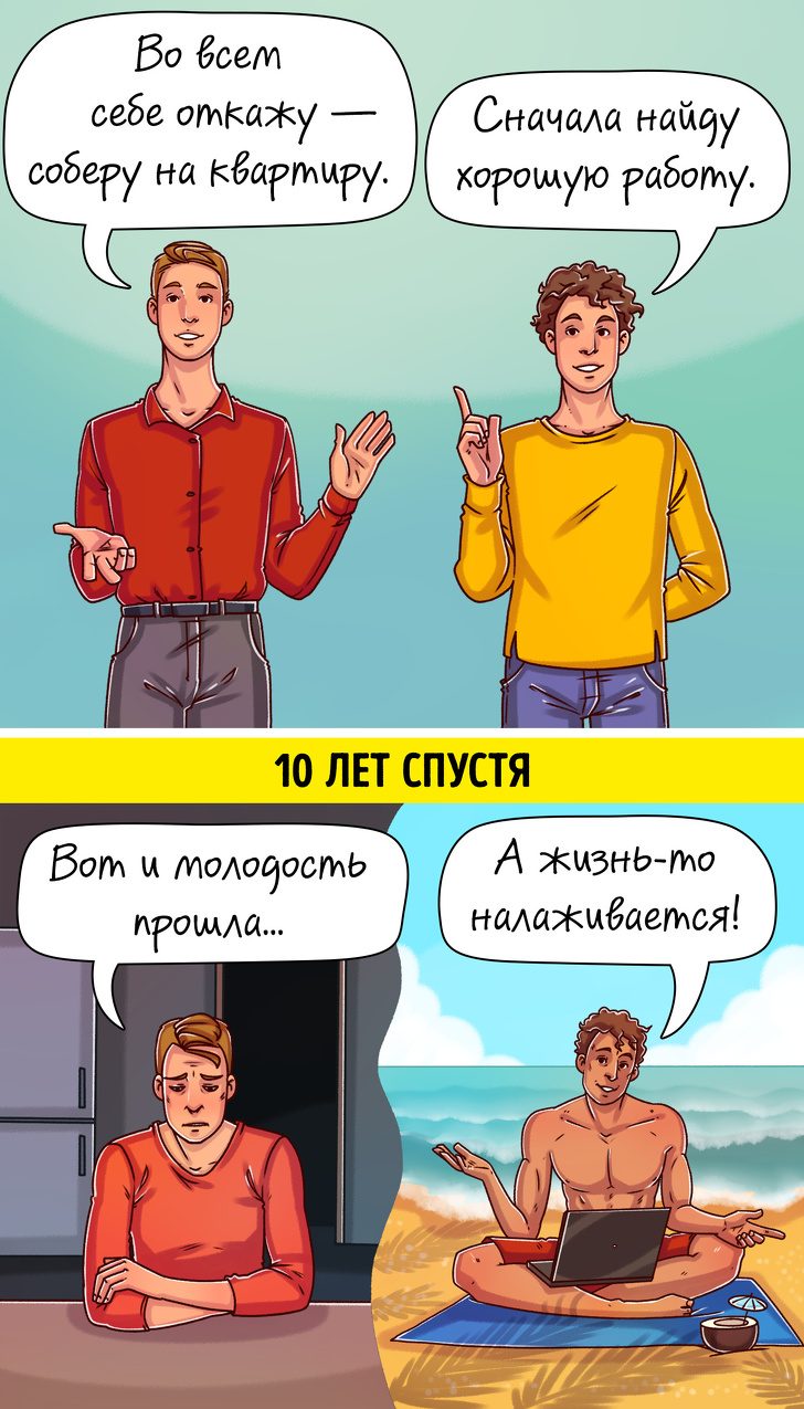 Вариант № 2: первые лет 5 инвестировать в опыт и знания, следующие 5 — решать квартирный вопрос. Или не решать и по-прежнему арендовать жилье или зимовать в хижине на берегу океана. Важно то, что спустя 10 лет вариант № 2 дарит возможность обменять свои знания на более высокую зарплату и право выбора. Ну а в первом случае человек будет вынужден и дальше снижать расходы, отказываясь от радостей жизни.