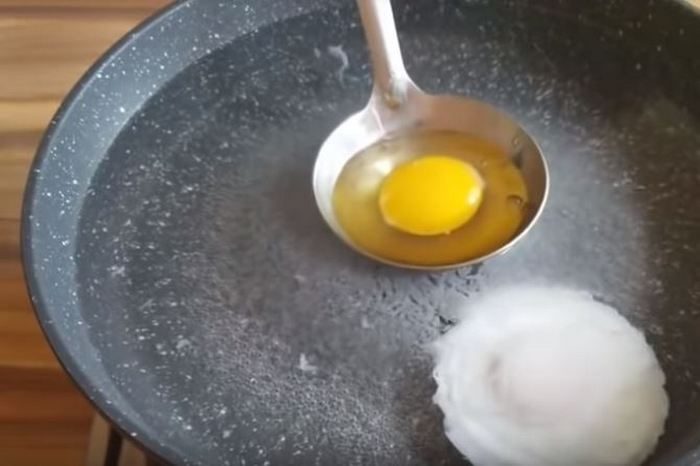 Если вода на сковороде кипит, то пришло время опустить в нее половник с яйцом так, чтобы в него не затекало содержимое сковороды. Возможно, придется удерживать половник все время готовки. Благо, ждать долго не придется. Через 10 секунд яйцо должно будет «схватиться». Теперь можно аккуратно зачерпнуть немного воды. Это поможет облегчить извлечение содержимого половника. Когда это будет сделано, яйцо бросается на сковороду с водой для завершения готовки. Пока это происходит, можно приступать к варке следующего.