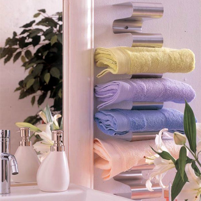 Декор санузла может стать проблемой, ведь аксессуаров для ванны не так уж много, да и не всегда есть возможность их использовать. Тем ни менее, в вашей ванне обязательно найдется место для полотенец. Так почему бы не сделать акцент на них. Все, что нужно для превращение полотенец в декоративные детали — оригинальная полка для полотенец.