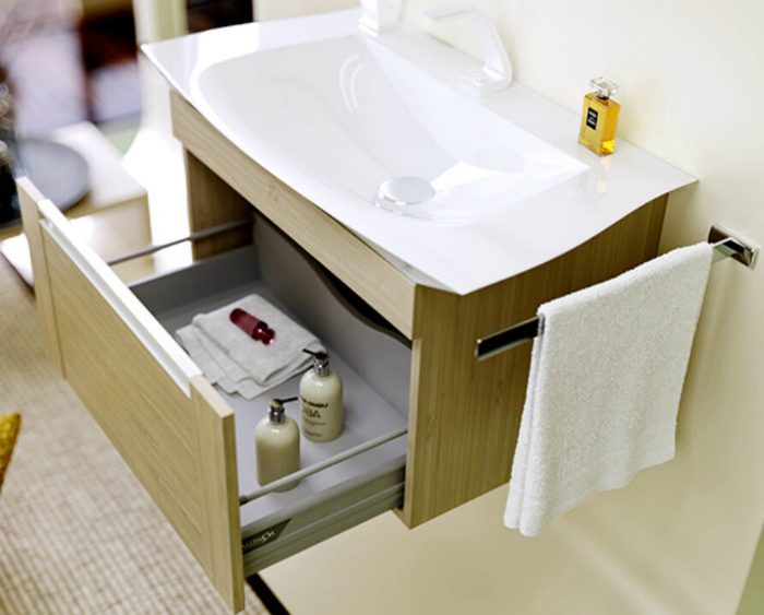 Выбирая тумбу для маленького санузла, сделайте упор на функциональный и лаконичный дизайн. Тумбы с выдвижными и открытыми ящиками, а также полотенцесушителем сбоку значительно улучшат обстановку небольшой ванны.
