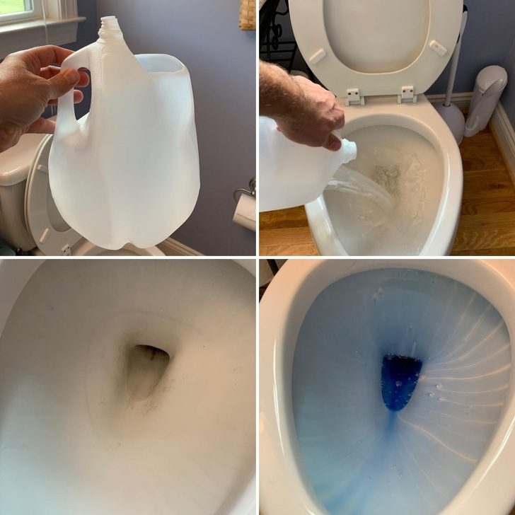 Отрежьте верхушку у пластиковой бутылки и наполните ее водой. Теперь вылейте жидкость из бутылки в унитаз: из-за разницы давления вода уйдет, и вы сможете добраться до самых труднодоступных мест.Этот лайфхак работает только с унитазами сифонного типа. Вода в них подается не в чашу, а в колено и создает своеобразный эффект торнадо.
