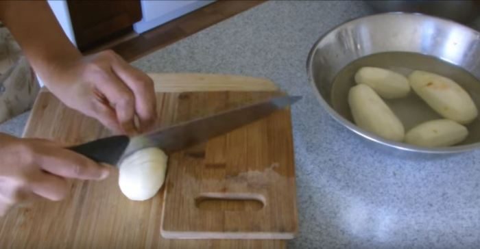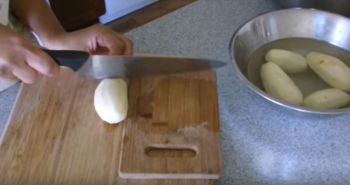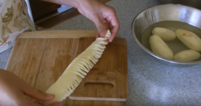 После того, как одна сторона картошки была покрыта надрезами и стала напоминать гармошку, плод переворачивается на 180 градусов вокруг своей оси. Теперь тоже самое делается с другой стороны, только уже под углом до 30 градусов. Это нужно для того, чтобы сделанные надрезы не встретились, и картошка не разломалась на части.