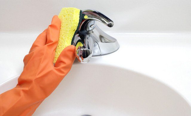 Размешиваем крахмал и ацетон (продается в любом строительном магазине, также можно взять любой растворитель) до получения кашицы, наносим её на очищаемую поверхность губочкой и оставляем на 15-25 мин. По прошествии времени слегка трем поверхность губкой и ополаскиваем водой.