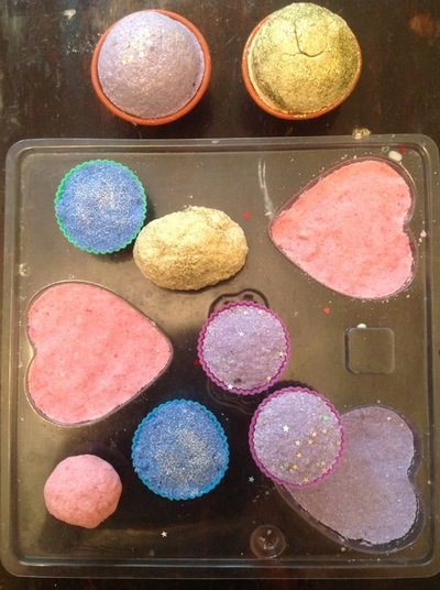 Идея: Блестки можно добавлять не только в состав для бомбочек — саму форму при желании тоже можно выложить мелкими и крупными блестками. Если вы так сделаете, то вся боковая поверхность бомбочки будет блестящей.