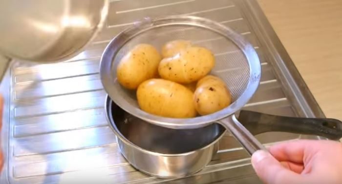 Как только картофель сварится, сливаем всю воду из кастрюли в еще одну кастрюлю (делается это только если далее из картошки будет готовиться пюре, в противном случае можно сразу сливать в раковину). Приготовленный картофель, лежащий все еще в кастрюле, нужно будет залить холодной водой из-под крана.