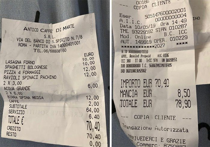 Происшествие с японцами случилось в ресторане Antico Caffè di Marte, хорошо известном туристам: оно находится в самом центре Рима, рядом с гробницей Адриана. Случай вызвал целую бурю возмущения в сети: как оказалось, это были не единственные туристы, ставшие жертвами нечестных на руку рестораторов.
