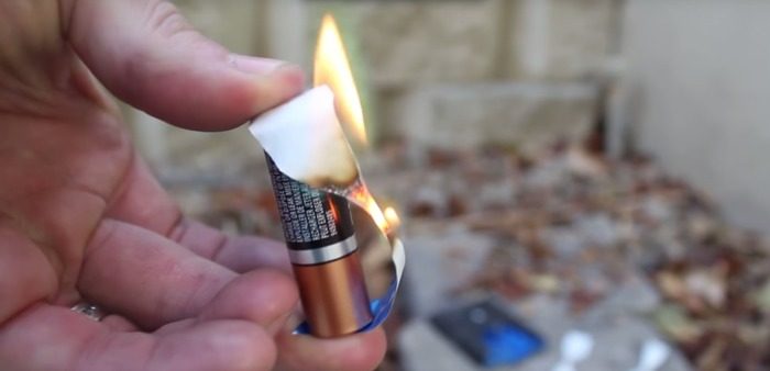 Из пальчиковой батарейки и небольшого количества фольги можно без особого труда соорудить зажигалку. Для начала фольга сворачивается в небольшую полоску. После этого она прижимается пальцами к полюсам батарейки. Очень быстро ток, перетекающий по фольге, нагреет ее до температуры достаточной для того, чтобы зажечь бумагу или сухую траву.