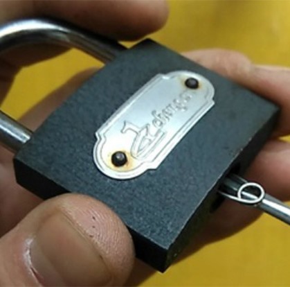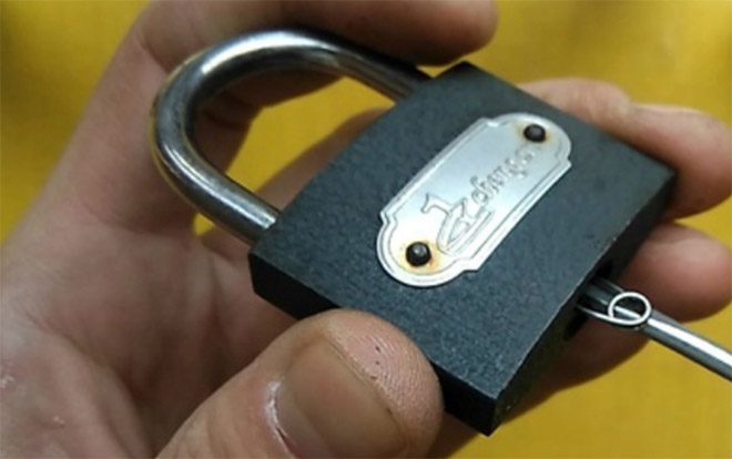 Иногда у навесных замков механизм расположен очень близко от скважины. Их можно открыть даже ножом, нужно просто найти механизм, соскоблить эмаль и повернуть рычаг.