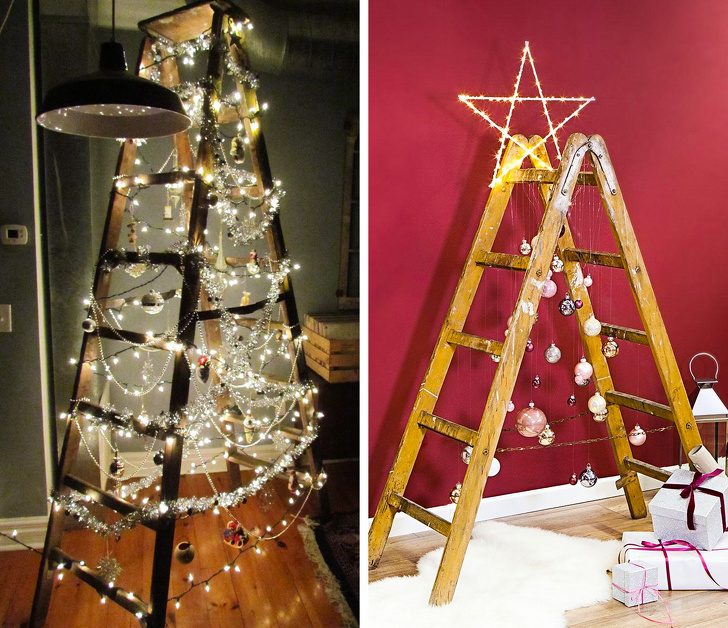 Даже те, кто начинает каждый раз нервно икать, услышав слово «поделка», легко справятся с такой альтернативой новогодней елке. Если задуматься, вся разница между тем, чтобы нарядить дерево, или украсить стемянку в том, что лестница не колется.2. Невидимая елка или елкамобиль