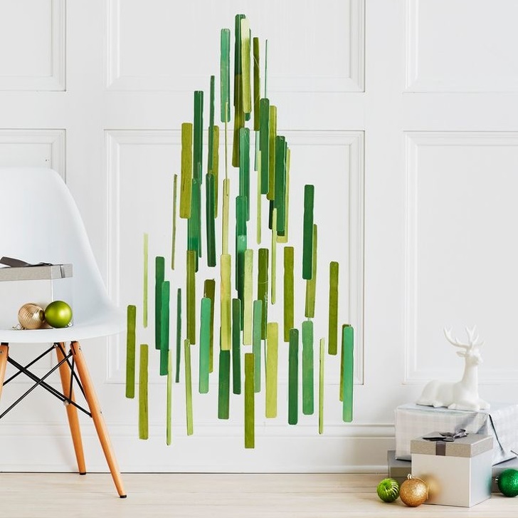 Этой идее уже не первый год, но парящие в воздухе елочные шары до сих пор завораживают нас. Чтобы быть оригинальным, на этот раз можно отказаться от игрушек в пользу обыкновенных палочек для размешивания краски.3. Елка для тех, кто любит выпить бокальчик вина