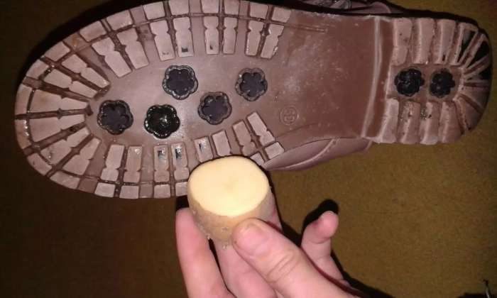 Точно так же, как используется картошка с подошвой обуви, можно применить обычный лак для волос. Получается намного лучше (зависит от используемого лака). Минусов у способа два. Во-первых, как и в случае с картошкой, хватает только для того, чтобы добраться только из точки А в точку Б. Во-вторых, никакого лака так не напасёшься.