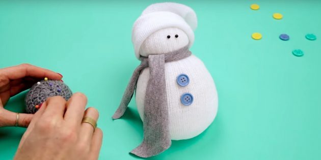 Повяжите на шею шарф из полоски ткани. Нижнюю часть второй половины носка подверните несколько раз. Наденьте получившуюся шапочку на голову снеговика.