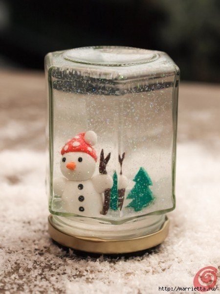 Новогодний снежный шар очень легко можно сделать своими руками из подручных материалов. Это один из самых популярных рождественских сувениров во всем мире. Для украшения сувенира можно слепить какую-нибудь фигурку, к примеру, как здесь, снеговика. Лепить можно из любой массы для лепки, кроме соленого теста, которое растворяется в воде.
