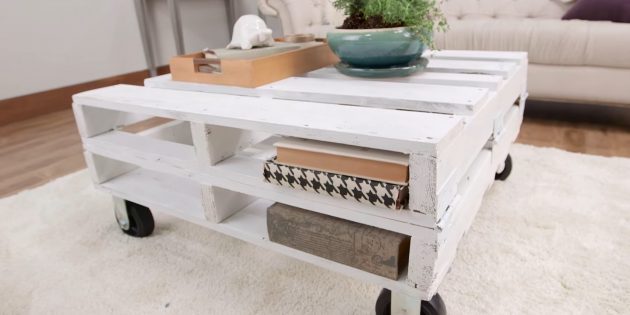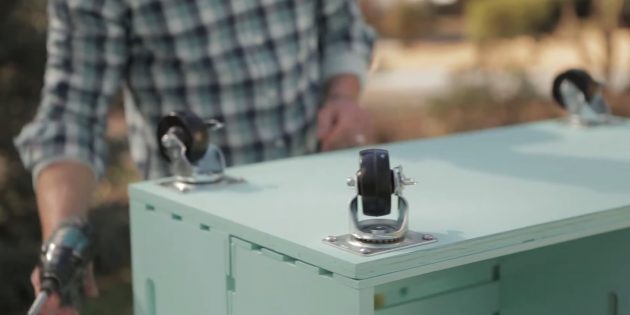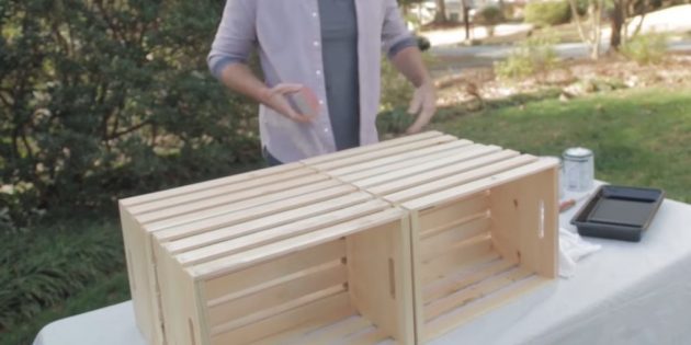 Зашлифуйте поверхность дерева, чтобы она была более ровной. Покрасьте ящики в бирюзовый или другой цвет. Авторы мастер-класса придали столику дополнительный эффект омбре. Все подробности есть в видео ниже.