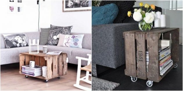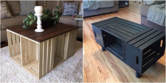 Этот столик с мягкими стенками тоже сделан из ящиков. Верхняя деталь снимается, поэтому внутри есть дополнительное пространство для хранения.