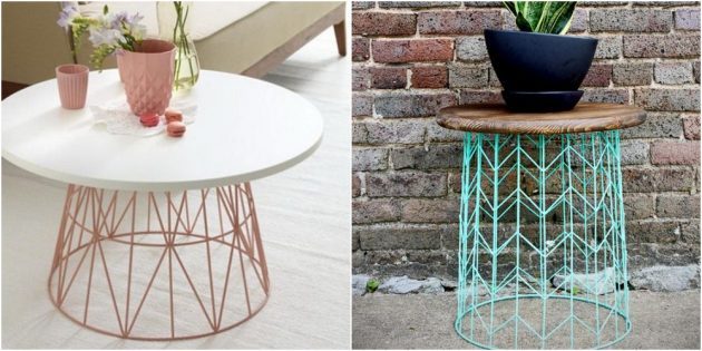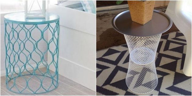 Корзину можно расположить дном вниз, а в качестве столешницы использовать большой поднос. А ещё можно взять плетёную корзину или покрасить столик в другой цвет.