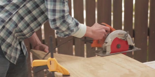 Поставьте ящики боком на фанеру в два ряда так, чтобы соприкасались друг с другом. Обведите на фанере контур будущего стола.