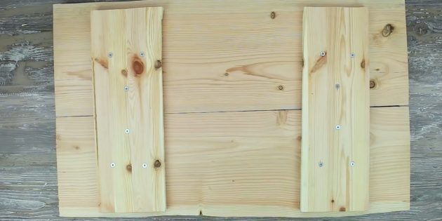 Просверлите по три отверстия, располагая их как вершины треугольника, в четырёх местах на маленьких дощечках. Не просверливайте насквозь основные доски. Всего должно быть 12 отверстий. Подробности есть в видео ниже.