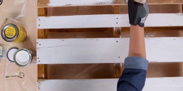 Когда дерево высохнет, окрасьте его в белый или другой цвет. Дайте полностью высохнуть. Не покрытые морилкой дощечки обоих поддонов не красьте.