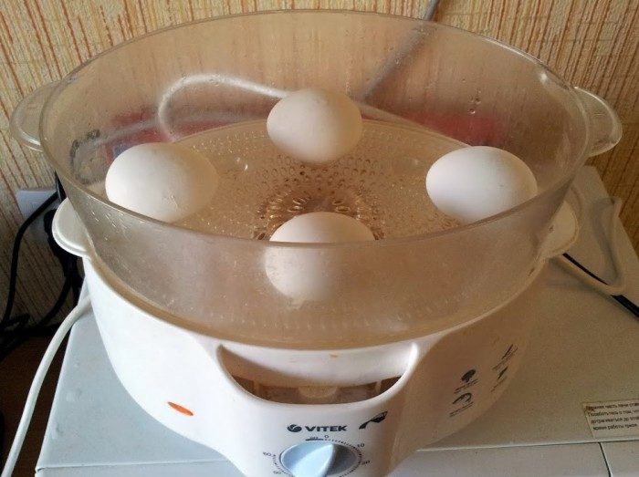 Для реализации второй методики понадобится пароварка. Яйца укладываются в нее трещиной вниз. Тут возможны два пути. Первый – подержать яйца в пароварке всего пару минут, чтобы ближайшая к скорлупе часть белка начала сгущаться и перестала вытекать. Второй – подержать яйца в пароварке 10-15 минут, после чего они тоже вполне себе отлично сварятся.
