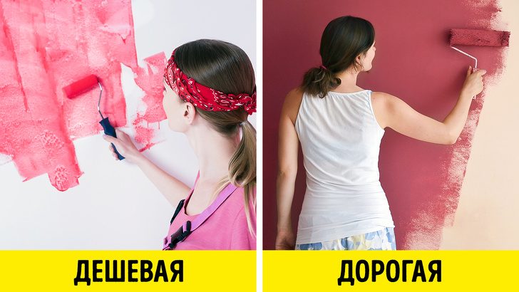 В случае покупки такой краски вы заметите ее главный недостаток еще во время ремонта: дешевый состав придется наносить минимум в 2 слоя, поэтому расход краски будет в несколько раз больше, чем у дорогого продукта.Качественную же краску можно наносить в один плотный слой, она меньше разбрызгивается и почти не пачкает пол, стены и одежду при нанесении. Кроме того, дорогой состав не потрескается, даже если в помещении бывают перепады температуры и влажности.