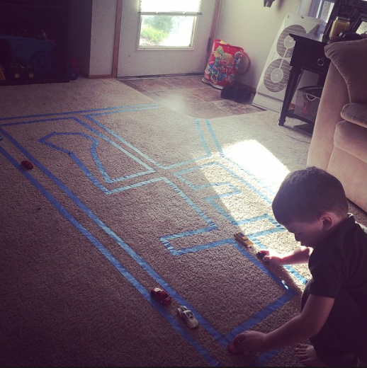 Чтобы детям было веселее играть с машинками, помогите им соорудить трассу на ковре с помощью скотча и щепотки фантазии.