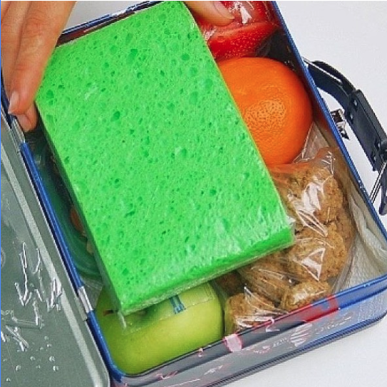 Чтобы фрукты, врученные ребенку для перекуса в школе, оставались прохладными и свежими, просто положите в контейнер замороженную губку в пакете с замком ziploc.