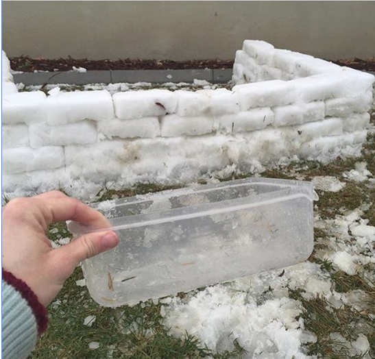 Детям будет веселее играть в снежки, если для начала построить защитную крепость или иглу. А лепить снежные блоки очень просто при помощи пищевого контейнера нужной формы.