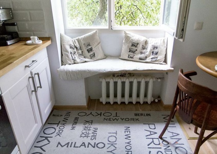 Необычный, но не менее эффективный вариант использования подоконника – скамья. Правда, он подходит для кухонь, которые отличаются средними габаритами (для маленьких помещений – это слишком большая роскошь). Перед тем, как превращать подоконник в скамью, измерьте его высоту (она должна быть примерно 45 см). Чтобы скамья было не только красивой, но и устойчивой, используйте деревянное сидение. Также необходимо побеспокоиться и о своей безопасности. Для этого установите на окна решетки. Чтобы они не выбивались из интерьера и подчеркивали стилистическое оформление комнаты, подбирайте экземпляр в тон.