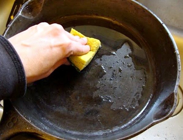 Для очистки понадобится источник открытого огня (например, газовая горелка), металлическая губка, емкость с водой под размер сковороды, пригодится также и обычное моющее средство для посуды, которое в обычном случае оказалось бы полностью бесполезным.