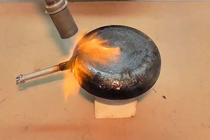 Работать нужно в безопасном месте, где во время обработки сковороды точно ничего не сможет загорится. Оптимально – на улице. Первое и главное, что нужно сделать, так это сжечь при помощи горелки весь нагар. Так как он по сути является застарелым жиром, то при достаточно температуре будет относительно легко сгорать. После этого сковорода опускает в емкость с холодной водой.