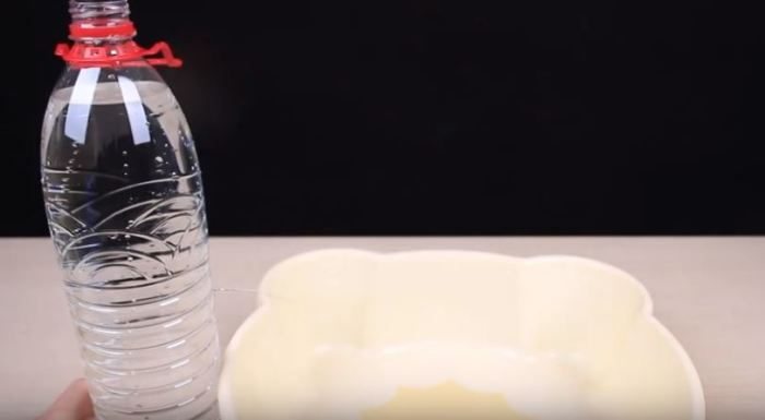Поверх бутылки устанавливаем кусок фанеры таким образом, чтобы просверленное отверстие совпадало с проделанной ранее разметкой. Теперь, берем пластиковую бутылку, делаем в ее стенке небольшую дырочку и закрыв ее пальцем – набираем воду. Далее устанавливаем ПЭТ бутылку с водой рядом с тазиком так, чтобы в последствии, падающая струйка воды попадала прямо в отверстие в фанере.