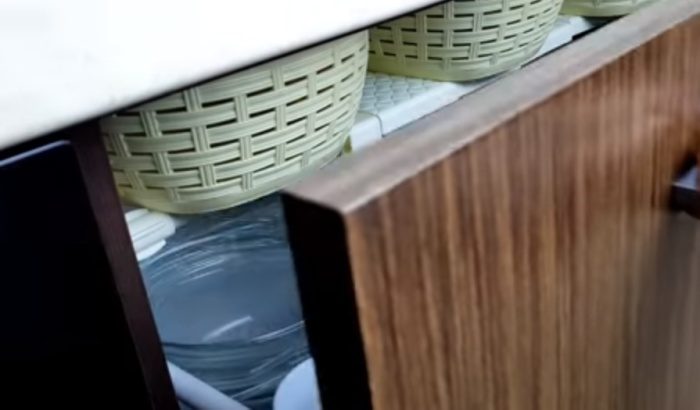 В кухонных гарнитурах часто встречаются высокие выдвижные ящики. И практически всегда они не заполняются доверху, из-за чего вверху остается свободное место. Это пространство можно использовать с пользой, если при заказе кухни сразу оговорить изготовление неглубокого выдвижного ящичка внутри большого. Если этот момент упустили из виду, ситуация решается установкой полочки самостоятельно. Для нетяжелых предметов типа пластиковых корзинок можно приобрести раздвижной телескопический вариант. Если планируется хранение сковородок и другого тяжелого инвентаря, тогда подойдет полочка из ДСП и нужно будет позаботиться о ее надежном креплении.