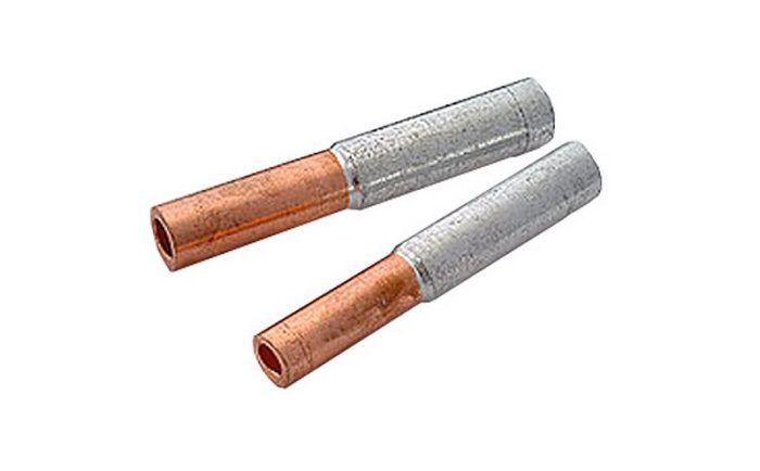 Один из самых компактных способов соединения проводов, сделанных из конфликтующих материалов. Трубка имеет два конца: один сделан из меди, второй из алюминия. Между ними находится стальная перегородка. Каждый провод вставляется в конце из своего материала, после чего необходимо осуществить обжимку контактов специальным инструментом. Это, к слову, и есть главная проблема, так как обжимной инструмент (кримпер) стоит денег.